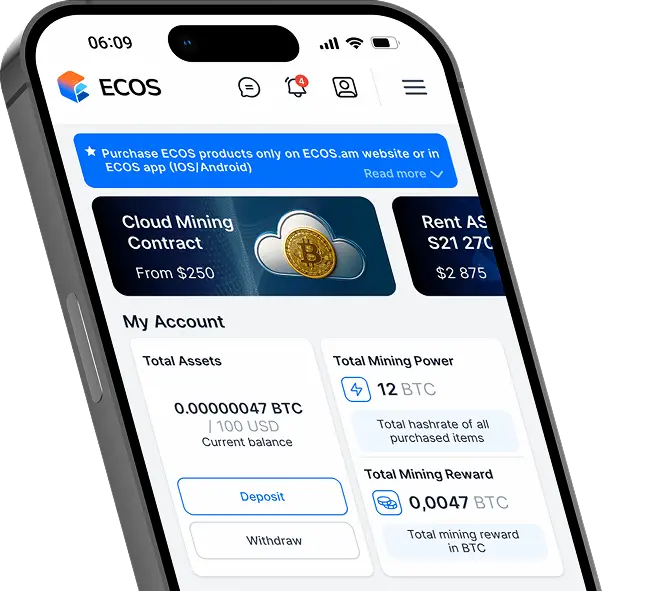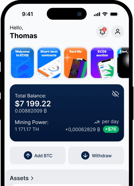 Steady Bitcoin rewards through mining. With ECOS, you benefit from low energy costs, full equipment management, and consistent returns without technical headaches.